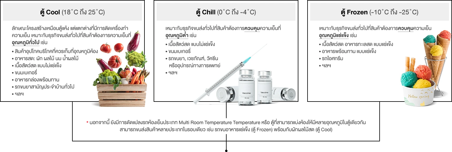 รถกระบะติดตั้งตู้เย็นเป็นอีกทางเลือกของผู้ประกอบการ ที่ต้องการขนส่งสินค้าควบคุมอุณหภูมิ เช่น อาหาร ยา ผักผลไม้ ที่ต้องการความสดใหม่ ทันตามความต้องการของลูกค้าและสามารถสะท้อนภาพลักษณ์ด้านคุณภาพขององค์กร (Brand) ซึ่งตู้เย็นในปัจจุบันแบ่งเป็น 3 รูปแบบ ตามอุณหภูมิ ดังนี้