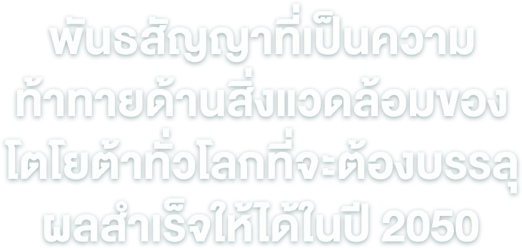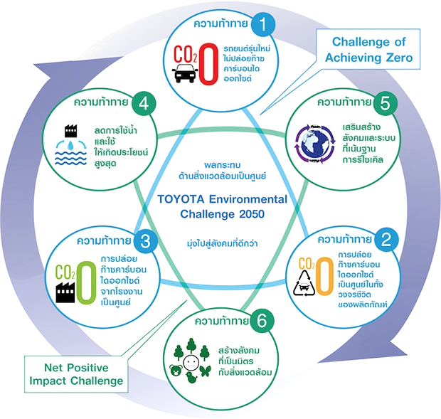 ความท้าทายทางด้านสิ่งแวดล้อมของโตโยต้า ที่ต้องบรรลุผลในปี 2050 ประกอบไปด้วย 6 ประการ ที่ถือเป็นความท้าทายที่จะลดการปล่อยก๊าซคาร์บอนไดออกไซด์ (CO2) และเพิ่มผลกระทบเชิงบวก เพื่อมุ่งไปสู่สังคมที่ดีกว่า โดยใน 3 ประการแรกจะเน้นเรื่องการปล่อย CO2 ให้เป็นศูนย์ และอีก 3 ประการต่อมาคือ ความท้าทายของการสร้างผลกระทบเชิงบวก