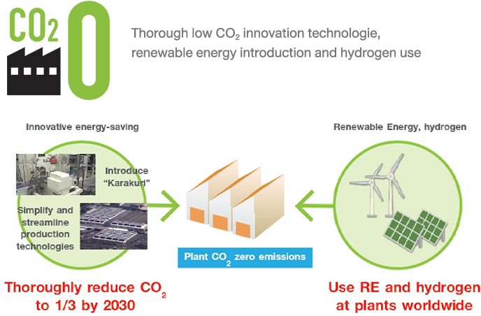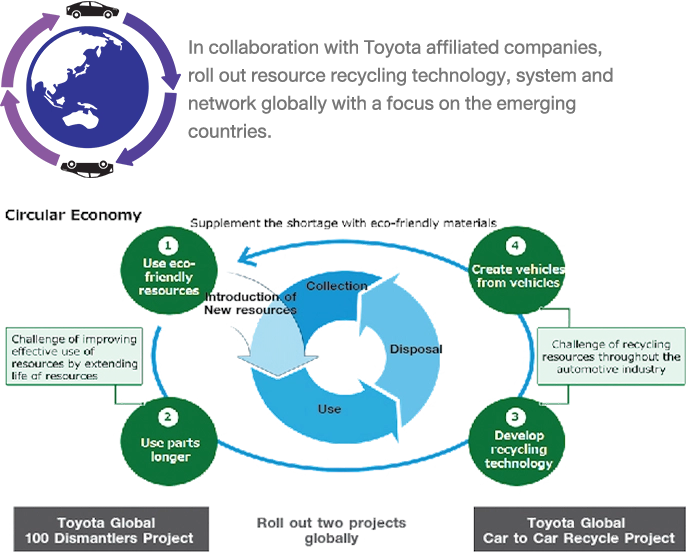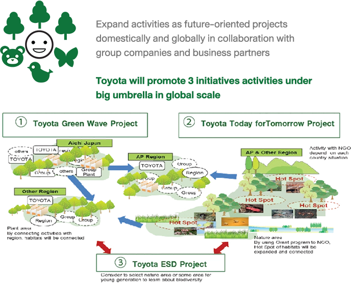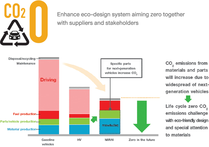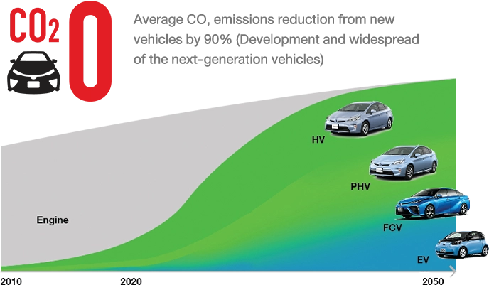 รถยนต์โตโยต้าในอนาคตจะต้องมุ่งสู่การปล่อย ก๊าซคาร์บอนได ออกไซด์ (CO2) เป็นศูนย์ โดยมีเป้าหมายลดการปล่อย CO2 ลง 90% ภายในปี ค.ศ.2050 (พ.ศ. 2593) โดยโตโยต้าจะเร่งให้ เกิดการพัฒนาทางเทคโนโลยีจากรถยนต์ไฮบริด ซึ่งใช้พลังงานไฟฟ้าร่วมกับน้ำมันไปสู่รถยนต์เชื้อเพลิง (Fuel Cell Vehicle) และรถยนต์ไฟฟ้า (Eectric Vehice) ในอนาคต