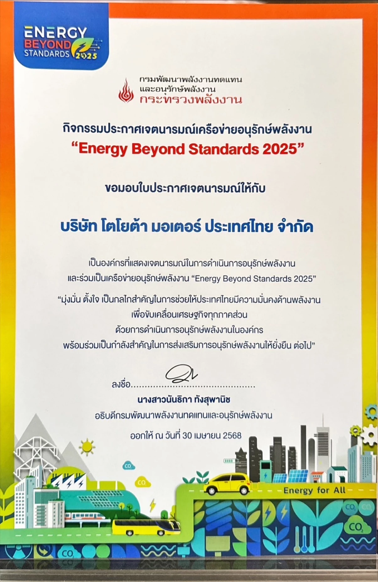 บริษัท โตโยต้า มอเตอร์ ประเทศไทย จำกัด ร่วมกับกรมพัฒนาพลังงานทดแทนและอนุรักษ์พลังงาน (พพ.) กระทรวงพลังงาน พร้อมด้วยกลุ่มธุรกิจ กลุ่มอุตสาหกรรม หน่วยงาน และองค์กรขนาดใหญ่ ร่วมประกาศเจตนารมณ์เครือข่ายอนุรักษ์พลังงาน ปี 2568 (Energy Beyond Standards 2025) เมื่อวันที่ 30 เมษายน 2568 ณ ห้องออดิทอเรียม อาคาร 50 ปี การไฟฟ้าฝ่ายผลิตแห่งประเทศไทย