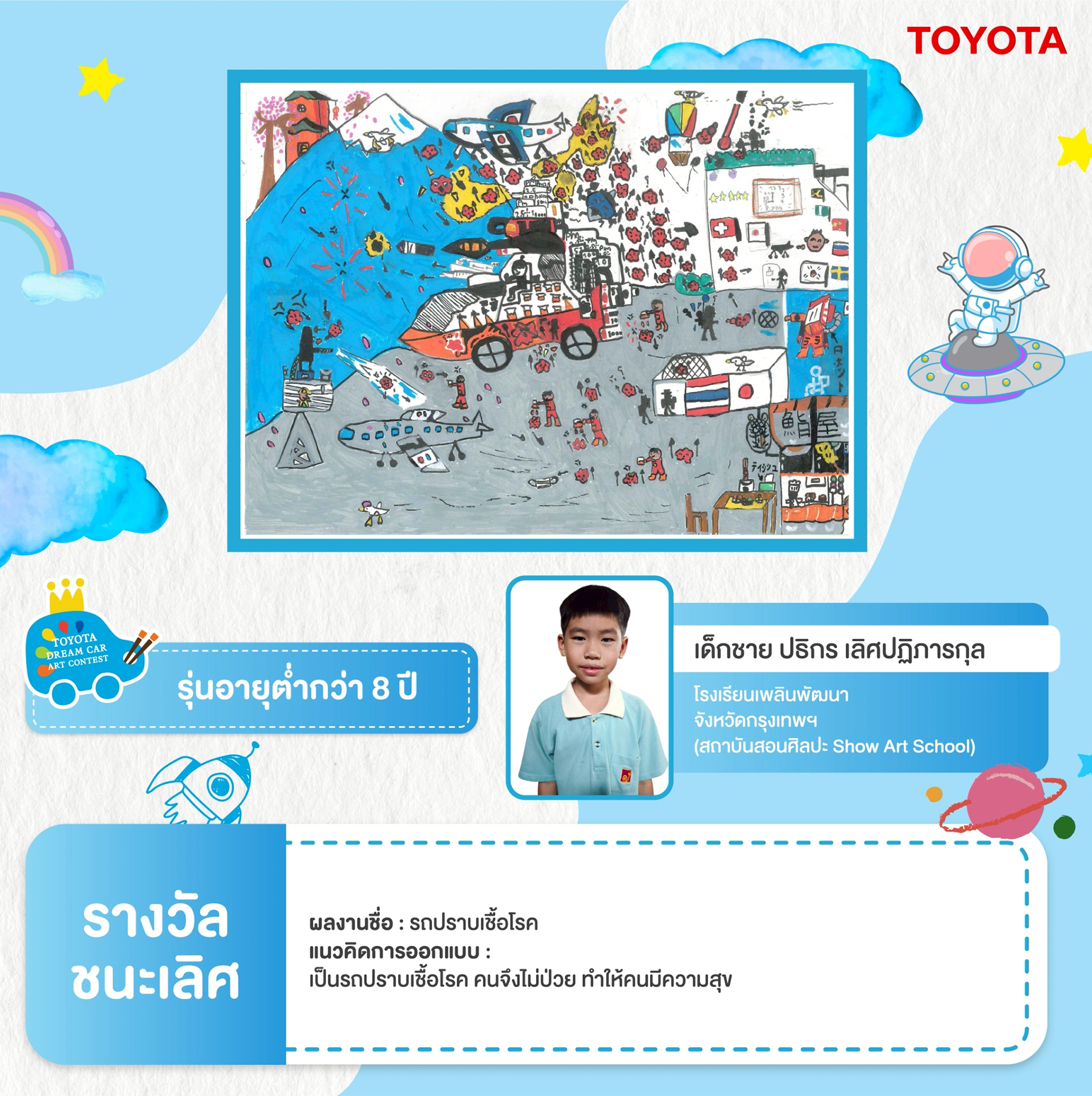 ขอแสดงความยินดี กับ จิตรกรตัวน้อยที่ได้รับรางวัลชนะเลิศ รุ่นอายุตํ่ากว่า 8 ปี จากการประกวดภาพวาดระบายสี Toyota Dream Car Art Contest 2025