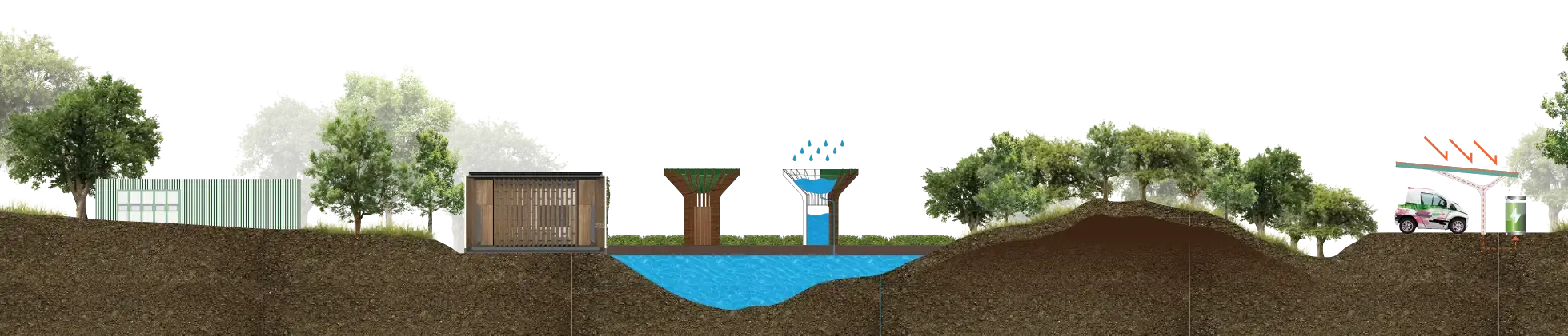 ส่งเสริมการใช้ทรัพยากรน้ำอย่างประหยัดและมีประสิทธิภาพ โดยออกแบบถังเก็บน้ำรูปทรงต้นไม้ เพื่อรองรับน้ำฝน ซึ่งโครงสร้างที่มีรูพรุนนี้จะช่วยเก็บน้ำไว้ใช้รดน้ำต้นไม้ และกิจกรรมต่างๆ ภายในสวน